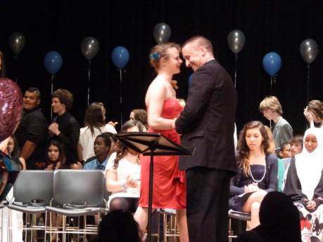 Zoey receives her “diploma” from her homeroom teacher, Colin Slingsby