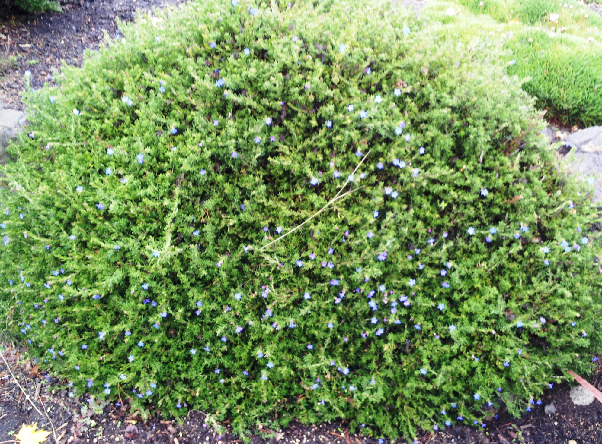 Lithodora diffusa ‘Grace Ward’. This is such a handy little shrub. Although it’s not the solid blue mass of flowers it is for a couple of weeks of the summer, it keeps at least a few blooms on it all year.