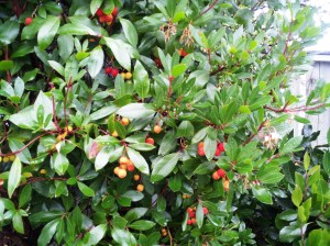 Arbutus unedo. Another handy shrub that blooms and fruits constantly throughout the year. The fruits are edible though bland.