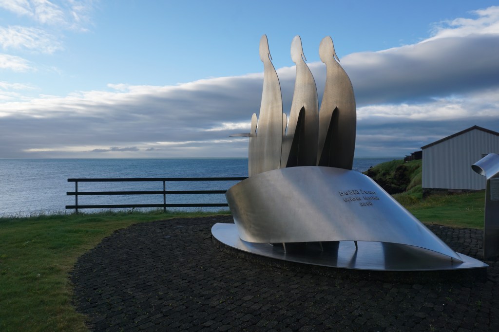 We encountered public art all over Iceland, even in a small fishing village like Hellisandur. Hellisandur is further known as the “Capital of Street Art” with over 30 murals. This sculpture overlooks the harbor. I am pretty sure that saw a fin of a pilot whale out there. Exciting!After spending our first night in the camper van during an Iceland summer (24 hours of daylight), we found that we did not need sleeping masks. We soon got used to sleeping with a little light peeking through the window curtains. We got up and had a breakfast of fruit, coffee, and skyr (Icelandic style yogurt, which is much like Greek yogurt except that in addition to being strained, it also includes vegetable rennet and is traditionally made with nonfat milk.) We checked our GPS and hit the road!