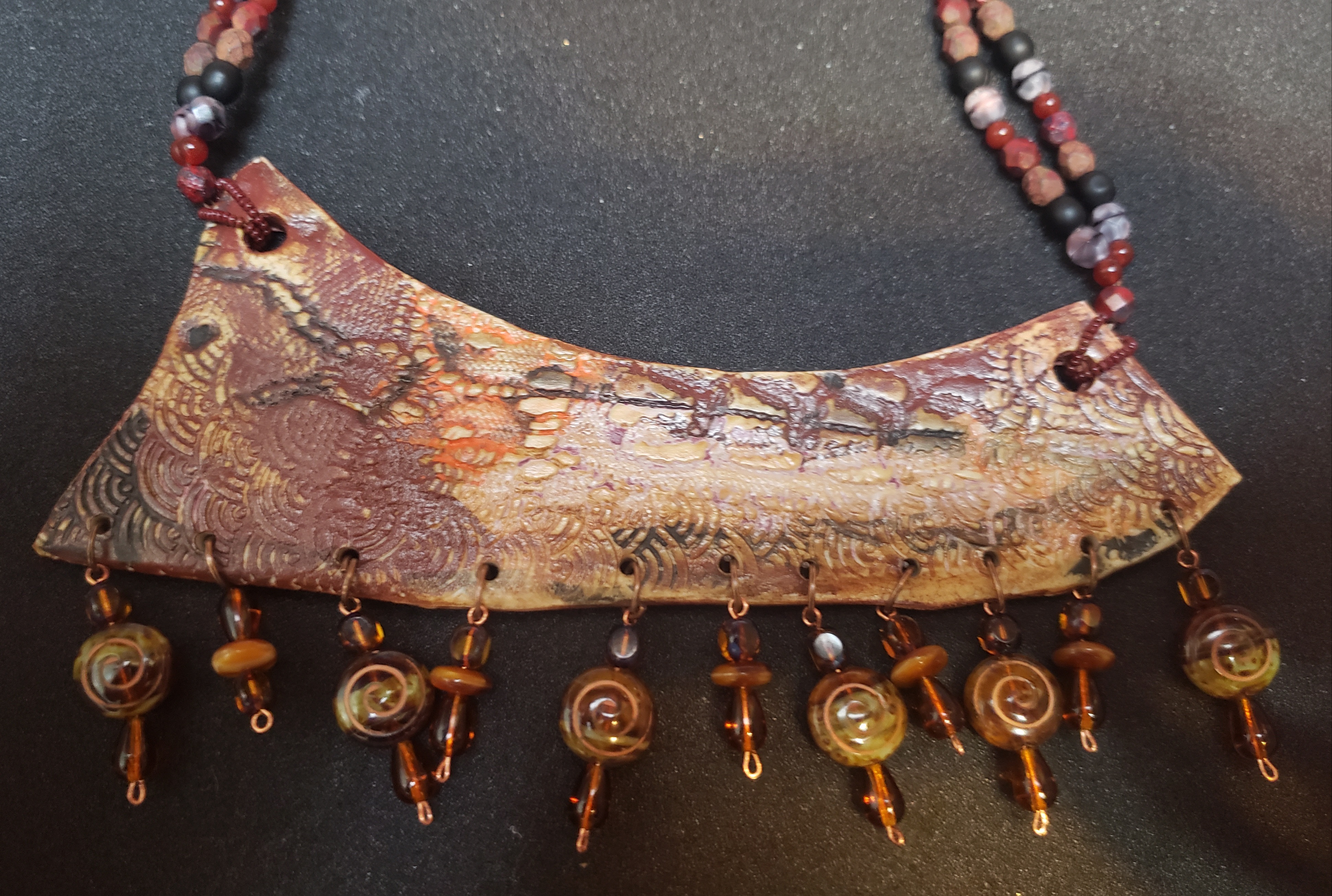 Pottery takes a long time to make and a substantial number of my pieces cracked, warped, or had glazing problems. I decided to combine an old hobby (beaded jewelry) with my ceramics and to make jewelry. I figured out some designs for pendants and miraculously, they had a really high success rate, getting through all of the clay steps and looking pretty. I made some pieces, like the one below, with clay scraps and others I cut with cookie cutters.