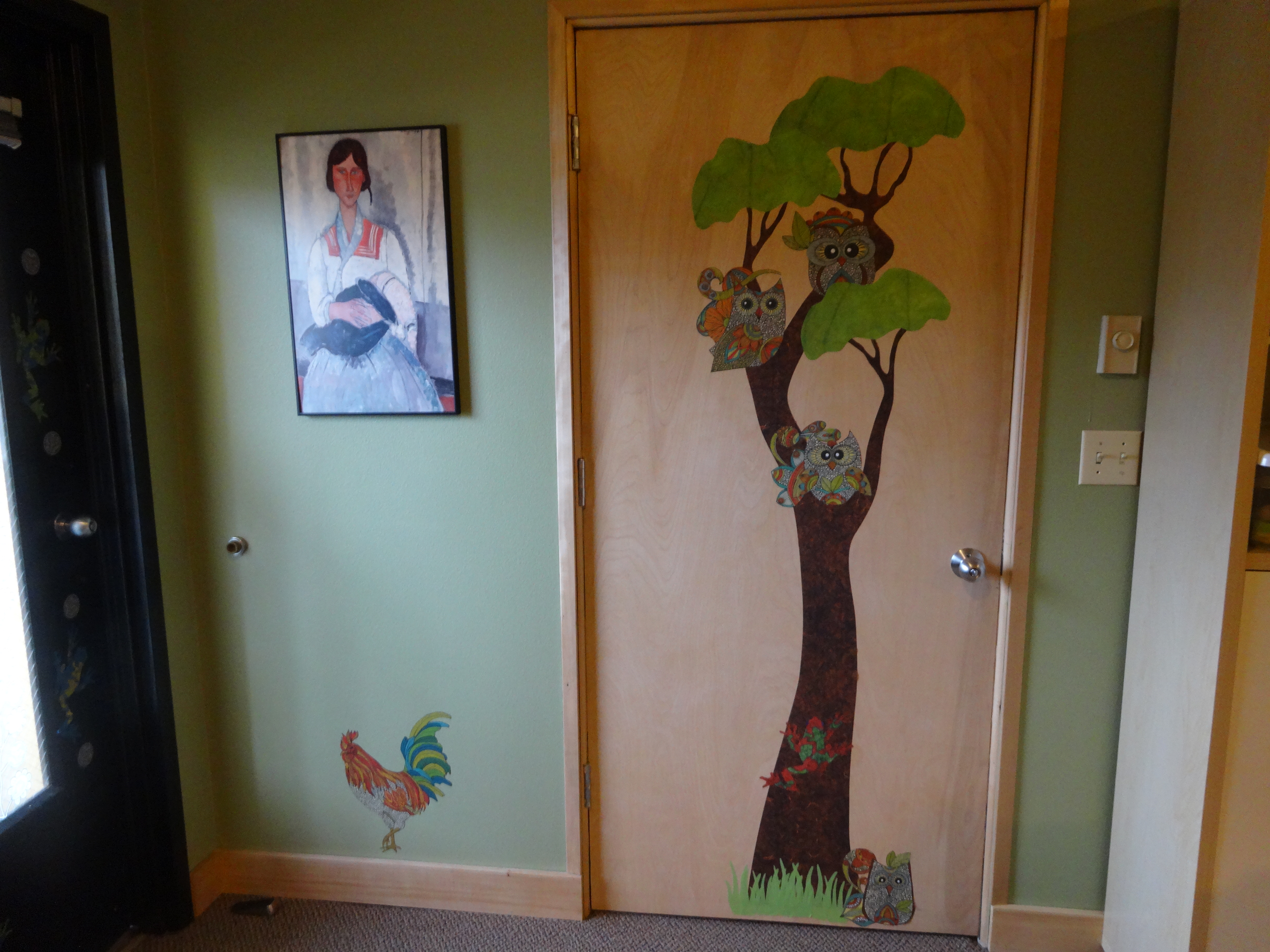 The purchase of the chicken and tree decals was inspired by the feeling of boredom I felt when I sat in the chairs across from the door of my office.