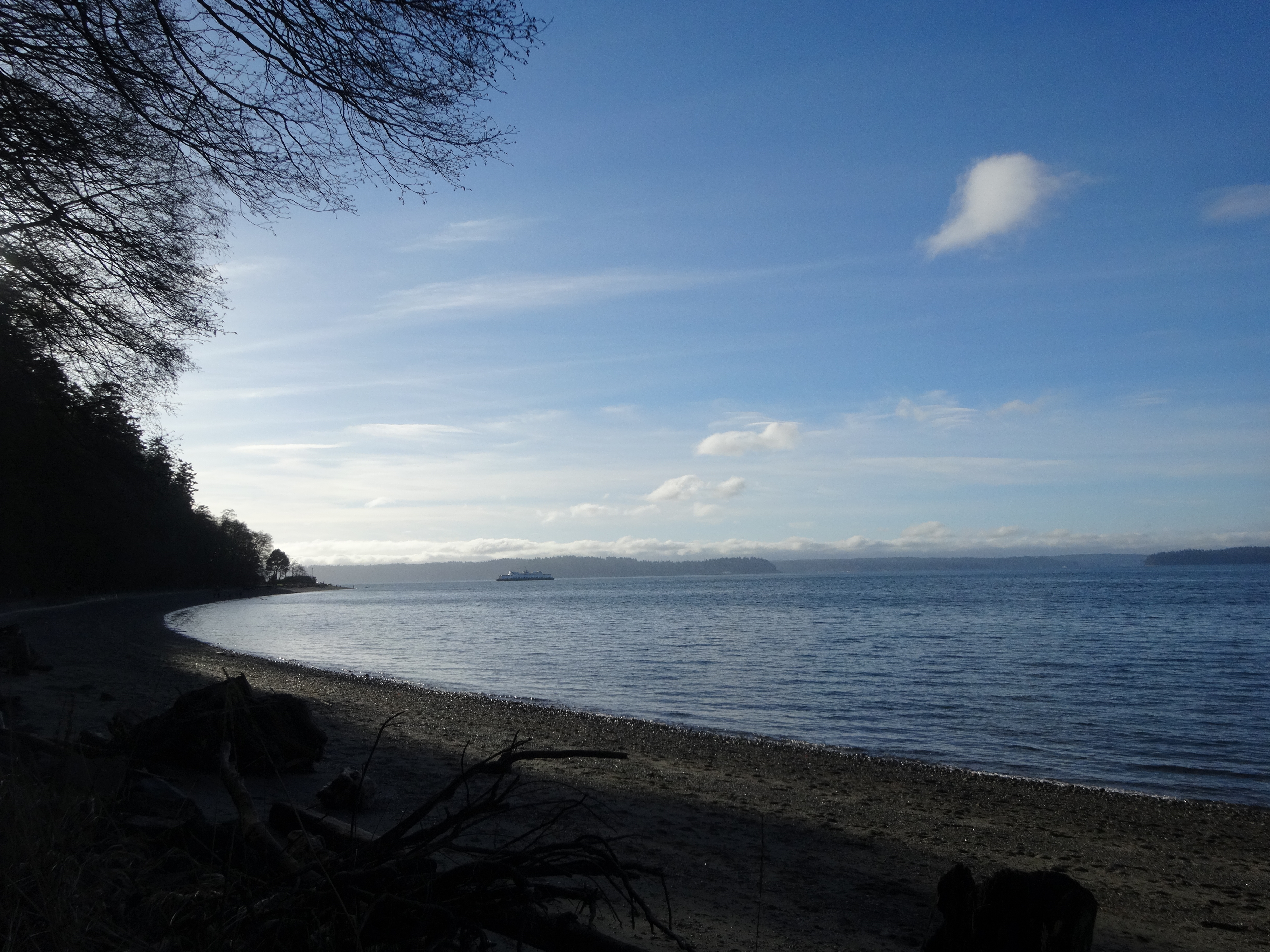 But even in winter, there are beautiful days. Yesterday, Christmas Day, was one of them. My husband and I walked down to the beach. The wind was gentle and the sky was blue. I spent a good bit of the walk stripped down to a short sleeved t-shirt. Granted, I had a Lupron shot last month and the furnace usually kicks in about this time but still, I was walking on a Seattle beach during winter in a t-shirt. What a glorious day.