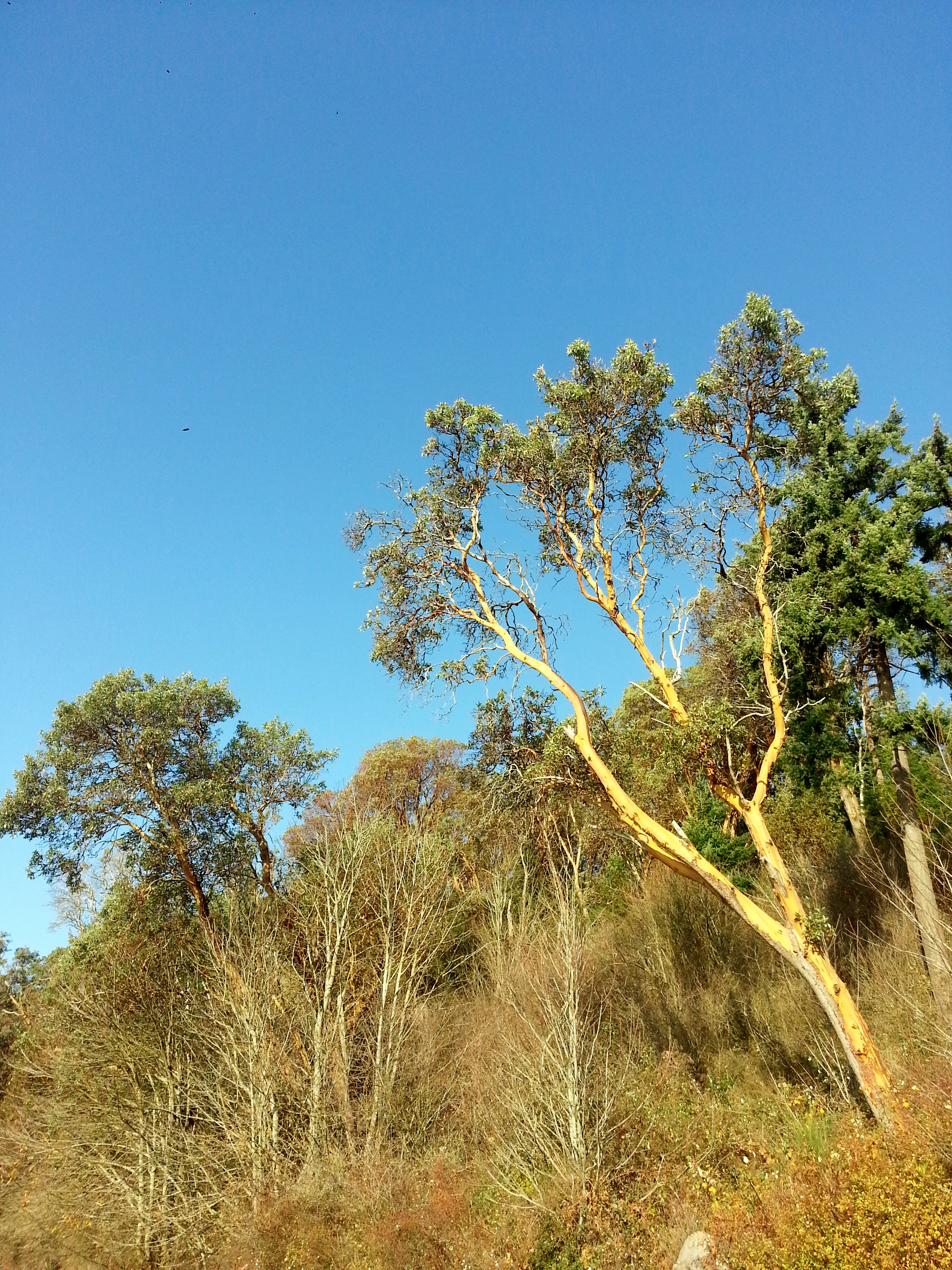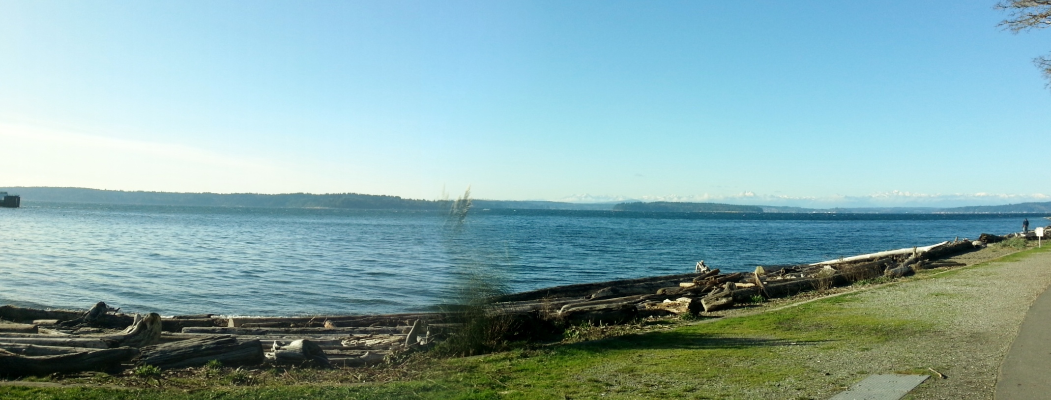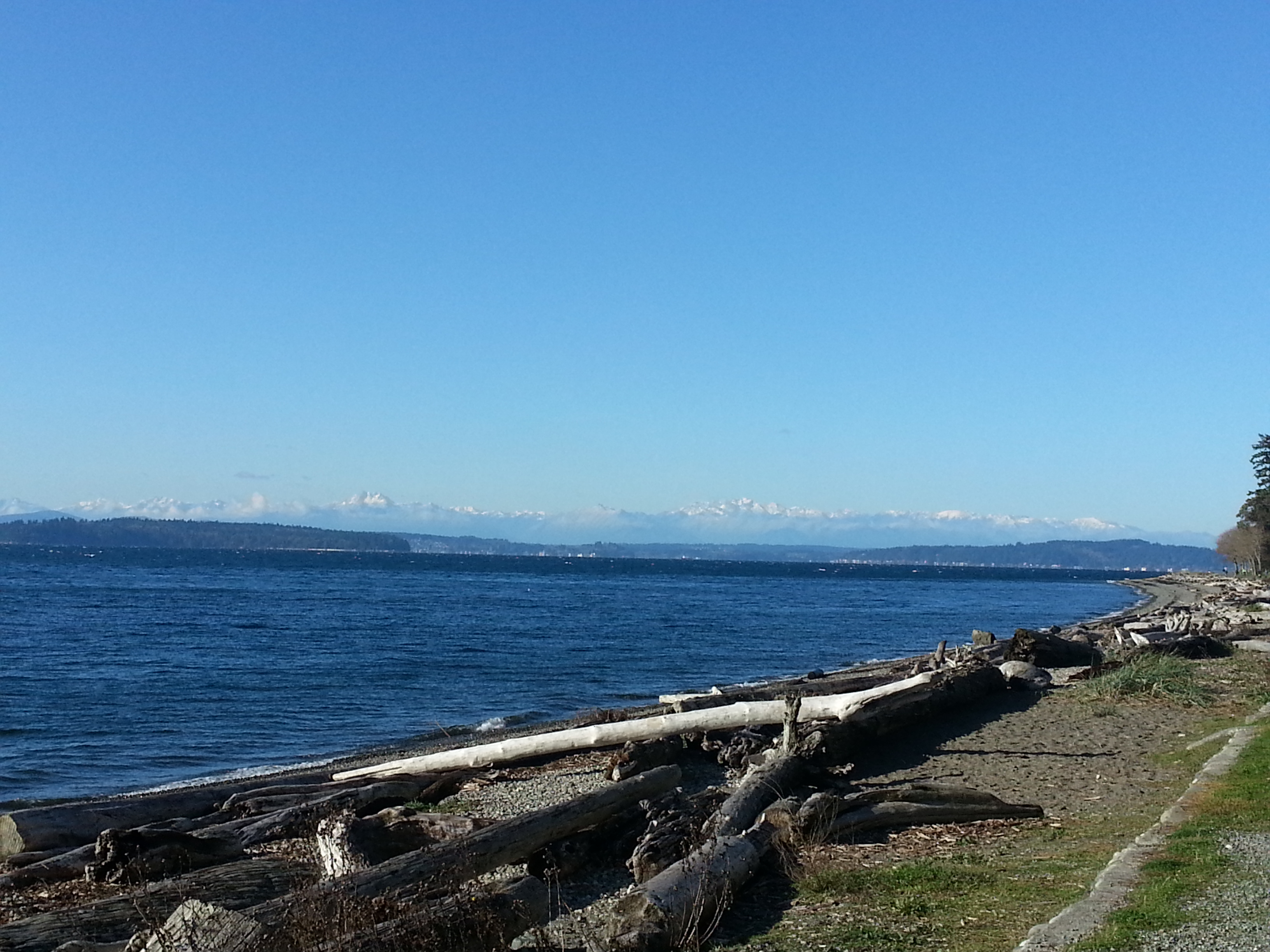 I continued, with coffee and gluten-free biscuit in hand on my walk. It was WAY too nice not to go to the beach. I didn’t have enough time to walk there so I walked a half mile back to my house, jumped into my car, and drove to Lincoln Park, which is on the Puget Sound. There was new snow on the Olympic Mountains. The sun was bright and the sky was a brilliant blue. The wind was strong and it was cold. But it was amazing! The water, the islands, the Olympic Peninsula, and the mountains were glorious. I saw osprey flying over the water and then suddenly drop to the water to fish. I saw cormorants and a few species of duck. At one point, I saw black figures as the waves broke. They were two harbor seals about 20 yards off of the coast. They were swimming along and coming up every several yards. I was able to walk along the beach fast enough to continue to observe them for several minutes. I have seen seals at this beach, but only 2 or 3 times in the past 10 years. The Pacific Madrone, one of my favorite trees, which only grow near salt water, were beautiful. The orange trunks with their peeling bark were beautiful against the blue sky. The towering Douglas fir were majestic.